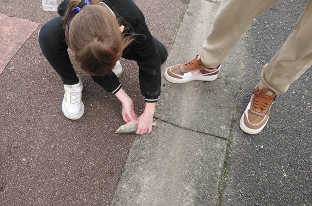 Mais les premières touches ne tardèrent pas à se produire, avec un certain succès. Finalement, les premiers gardons et les ablettes furent ferrés, pour la plus grande joie des petits pêcheurs qui lançaient fièrement : « Monsieur, j’en ai pris un ! » Les autres s’approchaient aussitôt pour admirer la prise, et, au fil des minutes, chacun a réussi à attraper au moins un poisson.