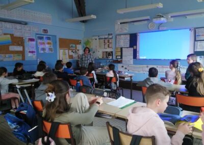 Adeline Capgras, agricultrice, a partagé son quotidien et son parcours. Issue du milieu agricole, elle a décrit une journée de son travail rythmé par les soins aux animaux, la traite des vaches le matin, le nettoyage de la stabulation, l’alimentation des veaux, puis la reprise des tâches en fin de journée. Les enfants, très curieux de cette vie très riche, l’ont interrogée sur la taille de son exploitation, le nombre d’animaux, ou le genre de céréales récoltées. L’agricultrice a répondu à toutes les questions « Mes journées se terminent souvent vers 19 heures », a-t-elle sourit, heureuse de son travail.