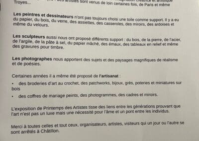 Cent quarante oeuvres sont présentées à l’espace culturel de la mairie. Peintures, sculptures, maquettes et photographies montrent le talent de tous ces artistes qui ont fait l’honneur de Châtillon et de cette association dont le dynamisme a été rappelé par son infatigable professeur, Daniel Girard, qui a formé des générations de peintres.