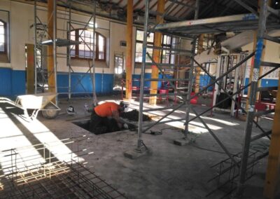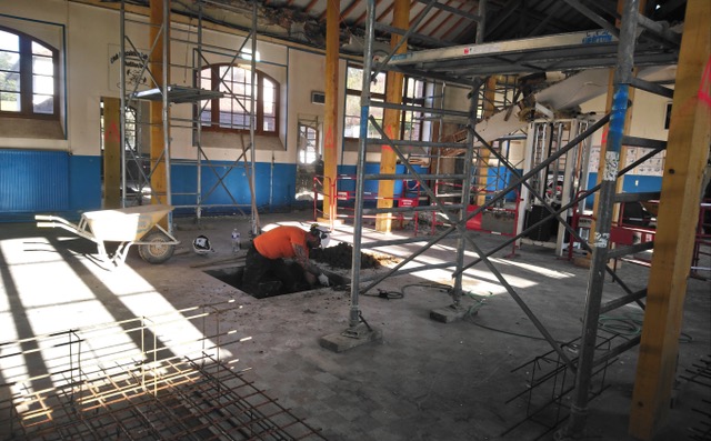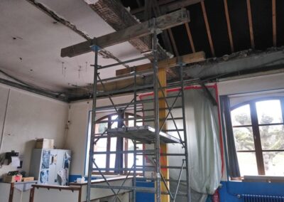L’entreprise Berton, mandatée par la commune, a commencé les travaux pour assurer le soutènement de la partie de la toiture affaissée. Des étais en sapin avaient été installés afin de maintenir provisoirement la structure existante. Ces travaux préparatoires ont nécessité la réalisation de fondations, avec le creusement de trois cavités d’environ un mètre de profondeur.