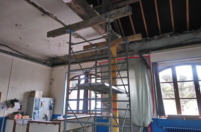 La charpente s’était effondrée. Par bonheur, cet effondrement a eu lieu lorsque la salle était vide des membres du club de musculation. Mais les dégâts étaient importants. L’expert, envoyé par les assurances, a décidé qu’il fallait refaire la couverture, la charpente et placer des poteaux de soutien.