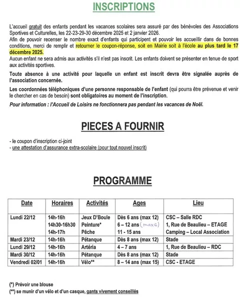 La participation des enfants à ces activités est gratuite et soutenue par les associations et la municipalité.